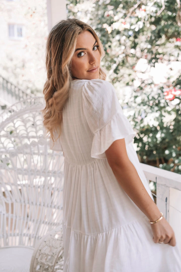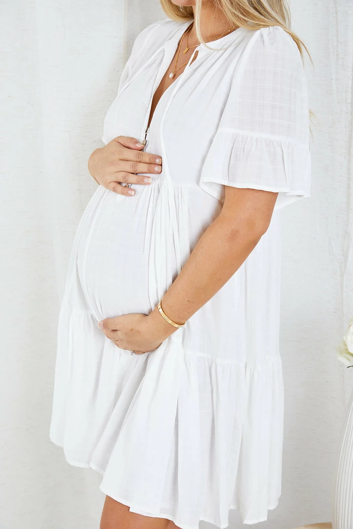 Our Cedar Dress comes in a classic fresh white in a relaxed fit. This mini features a v neckline with tassel detailing & functional buttons, perfect for breastfeeding mums. The frill detailing on the sleeves and tiered skirt gives this a flowy look. This effortless piece will surely become a staple in your summer wardrobe!