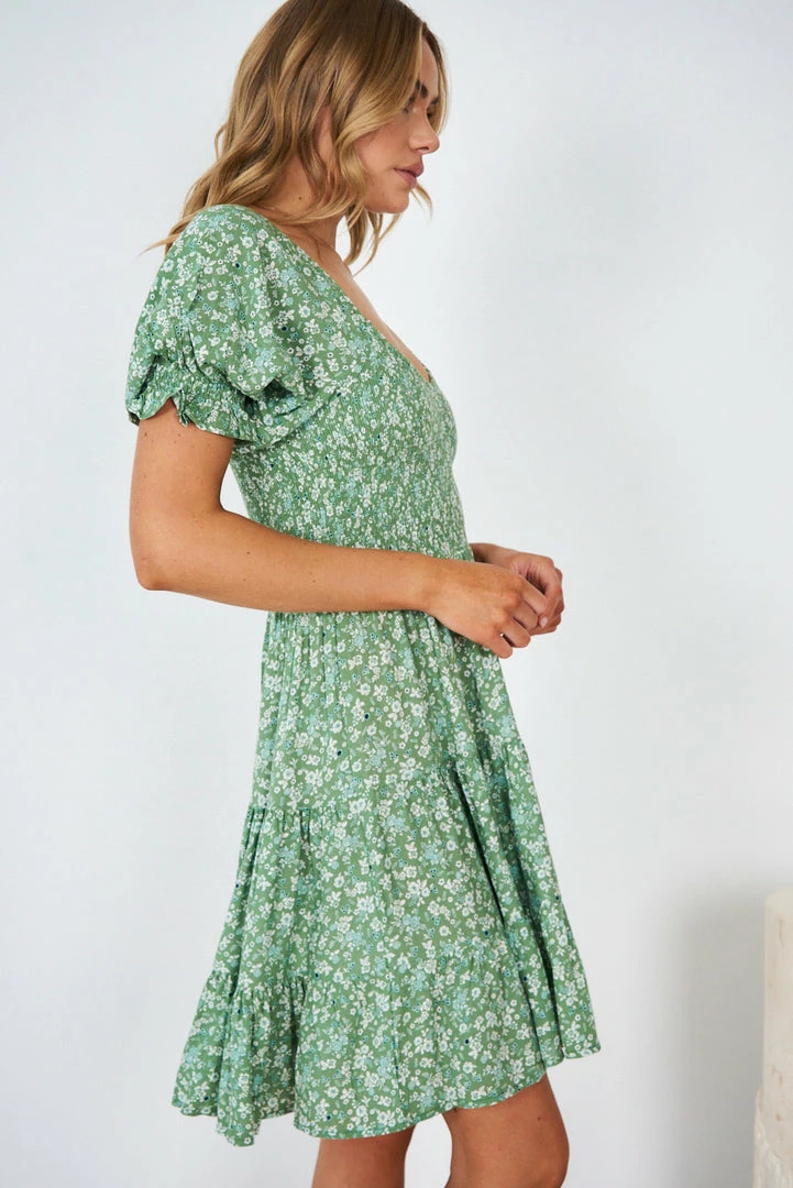 Our Geraldine Dress comes in a green tone base, with a white & light blue floral print. It features a round neckline, short sleeves, and a tiered skirt. This flowy midi pairs beautifully with heels for an effortless transseasonal look!