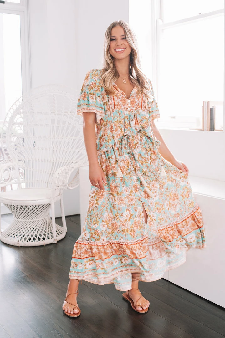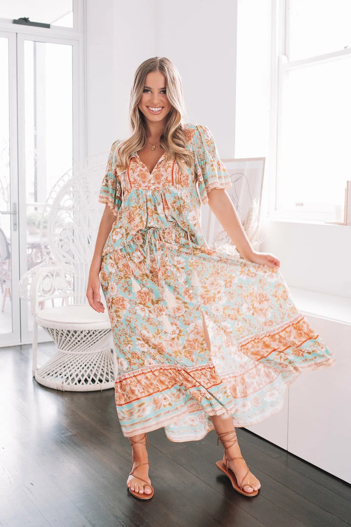 Our Marina Skirt is a vibrant turquoise base with pastel pink, peach, beige and orange toned floral print. It’s a gorgeous lightweight material in a relaxed boho style. The elastic waist features a drawstring that allows for comfortable customisability with a fun tassel detail. The skirt features a gorgeous frill detail on the hemline in a contrast print and a front split for effortless strolling. Pair with your fave ribbed crop during the Summer or a chunky cream knit during the winter.