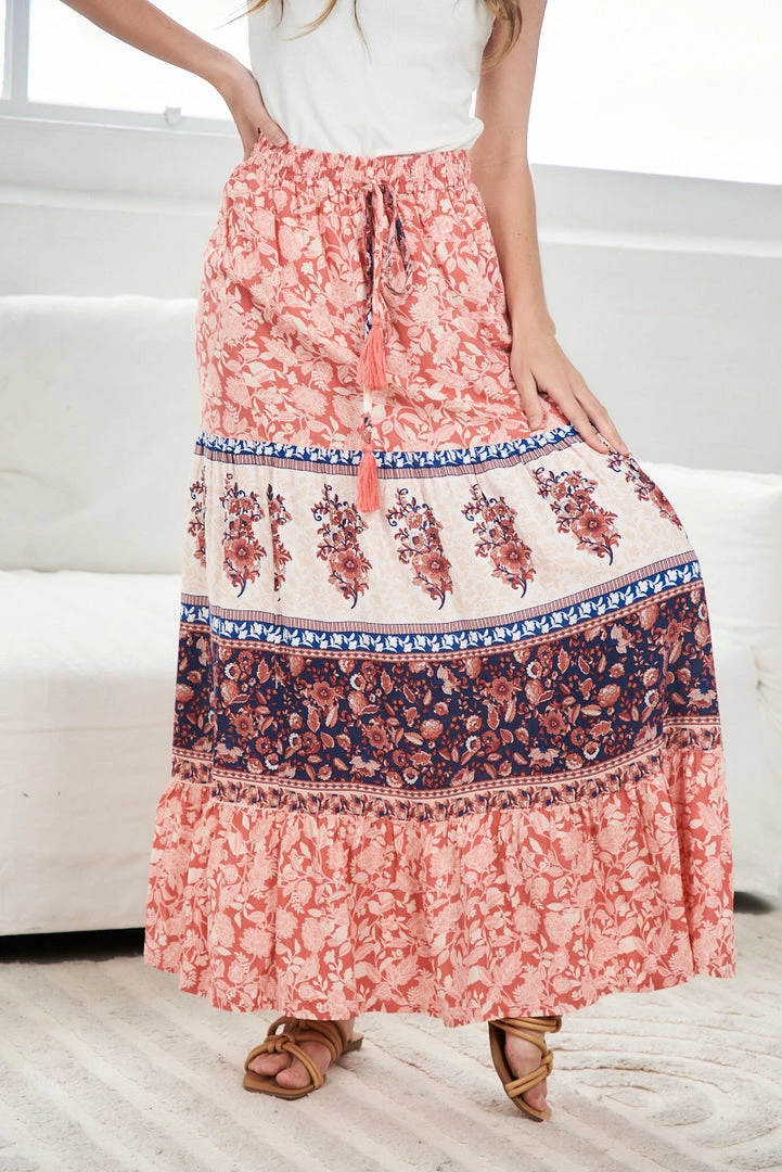 Our Riley Skirt comes in a orange coral tone print. It features a maxi length and an elasticated waistband with drawstring for a relaxed, comfortable fit. This skirt pairs perfectly with a basic top for a relaxed seasonal look!