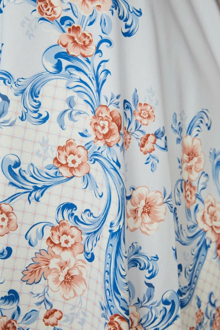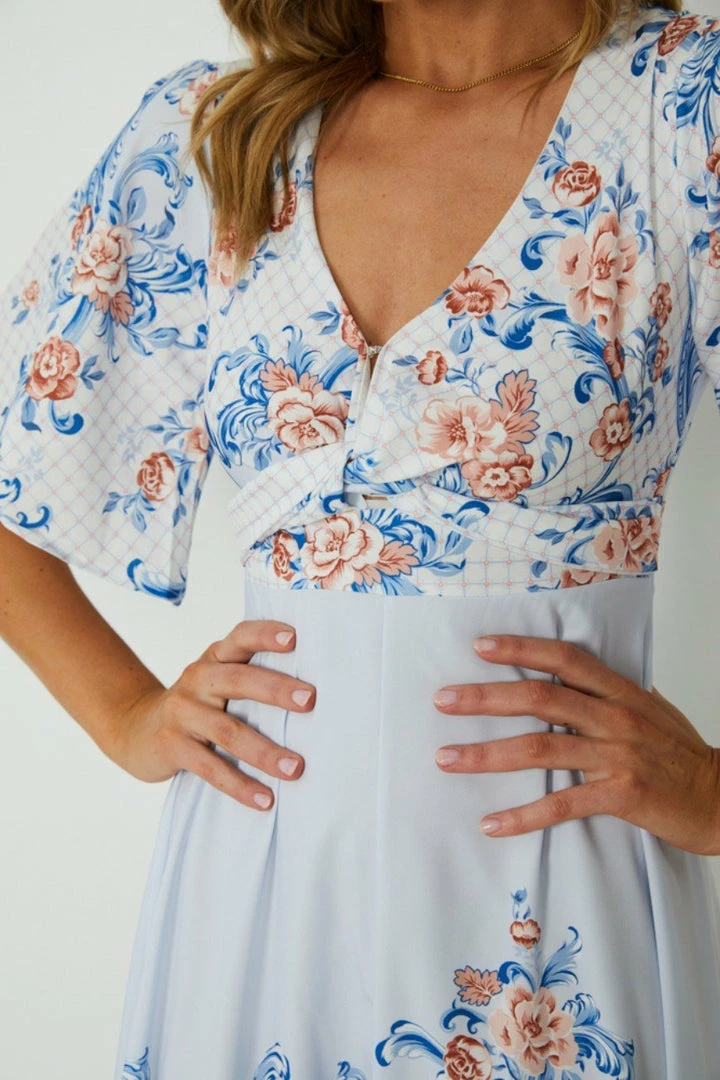 Our Sarmie Dress is a lovely light blue base with baby pink, tan, & floral print. This printed midi comes in a lightweight non-stretch fabrication that you’re sure to love. The gorgeous wrap style bust detail is a feminine touch. The skirt flows out making this ideal for a day out with the girls.