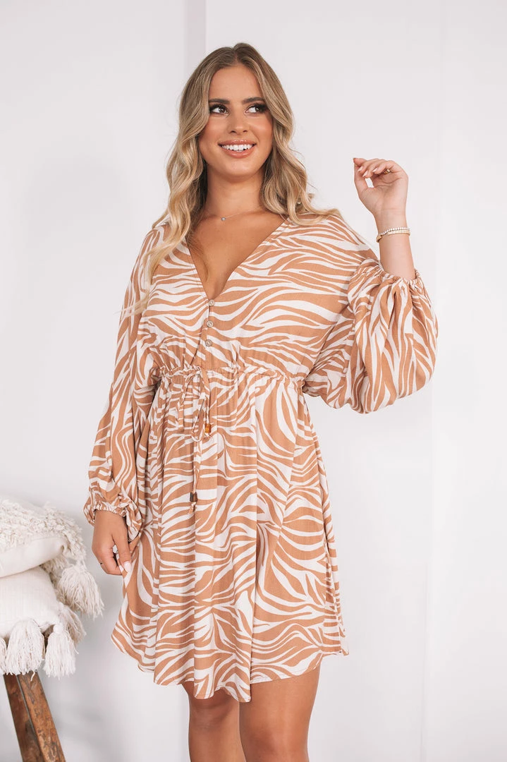 Our Alfia Dress comes in a stunning white and tan toned zebra print. This adventurous mini features a V neckline, buttons on the front, adjustable waist drawstring and cinched sleeves. This mini can be easily dressed up or down for brunch or drinks with the girls.