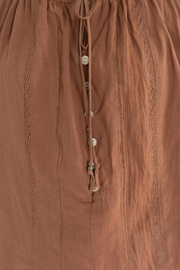 Our Elke Top comes in a light chocolate tone in a lightweight fabric. It features a keyhold neckline, button detailing on the front, and 3/4 sleeves cinched at the cuff for a comfortable fit. This top pairs beautifully with a skirt or pants for a classy evening look!
