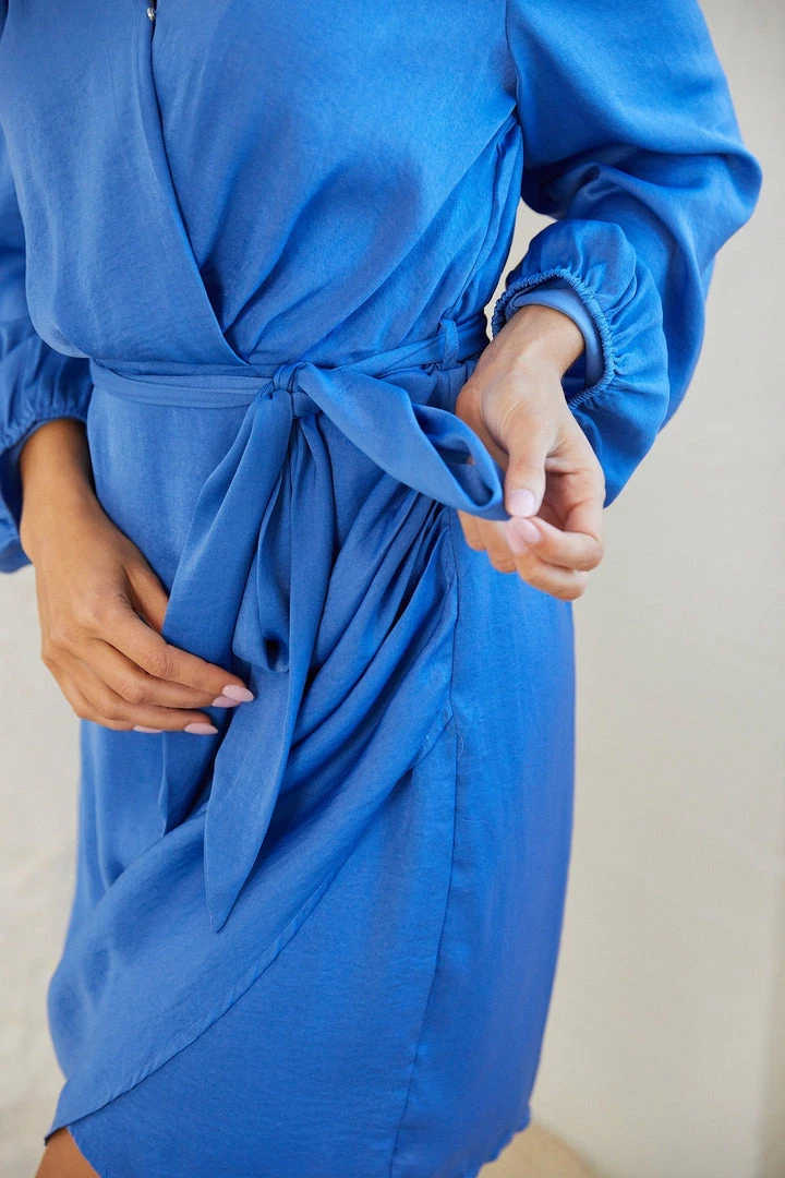 Our Hatilla Dress comes in a sapphire blue colour. Illuminate the room in this wrap style mini that features a surplice neckline, long elasticated bishop sleeves and a fabric waist belt. Be eye-catching with a tangerine tone crystal necklace and a mini leather handbag!