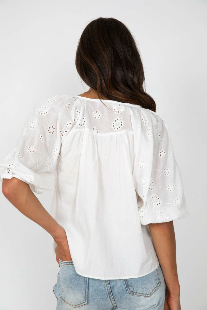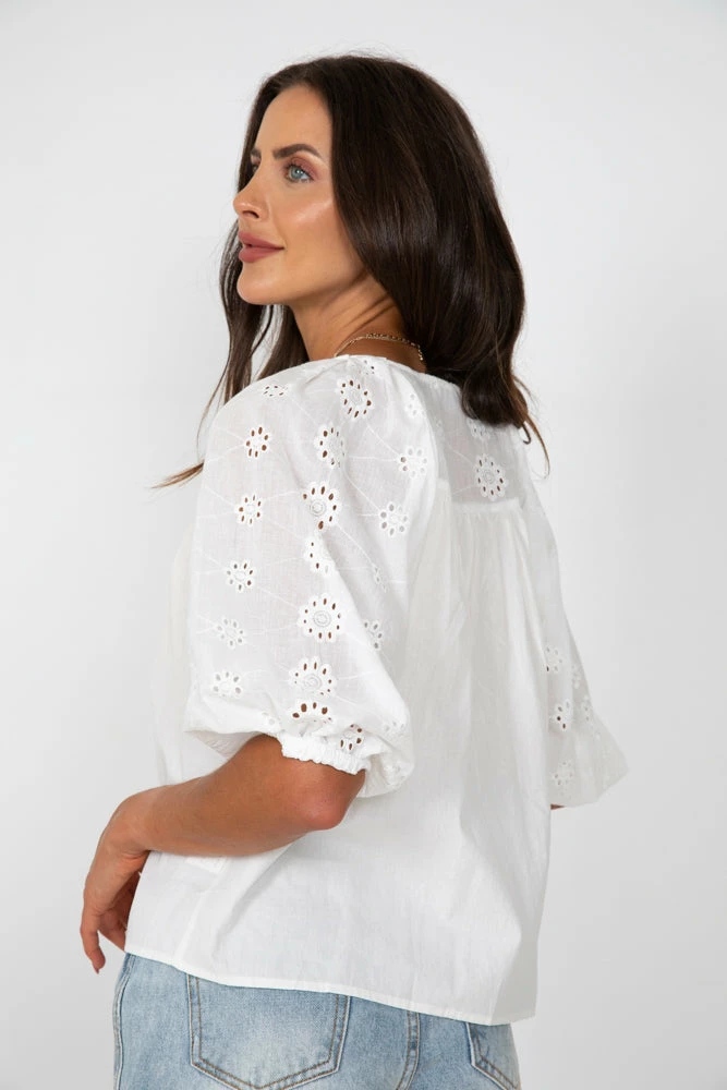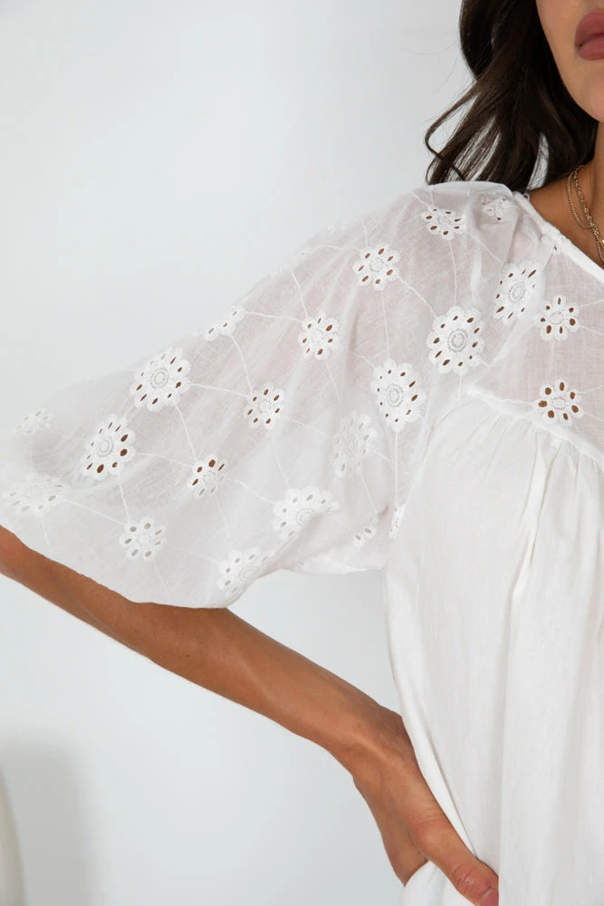 Our Yuka Top is a classic white tone. It’s a gorgeous medium-weight cotton material, the sleeves are graced with crochet detailing making this a gorgeous boho style. It features a round neck and buttons down the front of the garment. You can pair this lovely top with your favorite skirt and heels for a sophisticated spring look!