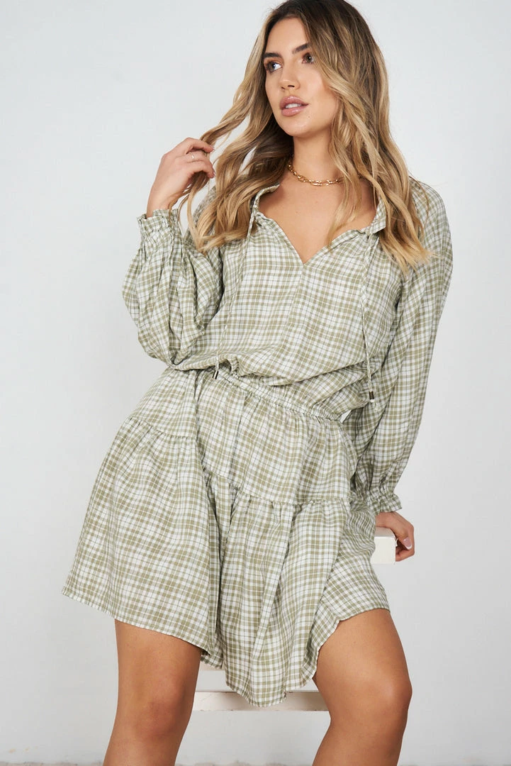 Our Peggie Dress comes in a khaki green & white tone print. It features a v neckline, long bishop sleeves, and a tiered skirt. This flowy mini pairs beautifully with heels or boots for an effortless transseasonal look!
