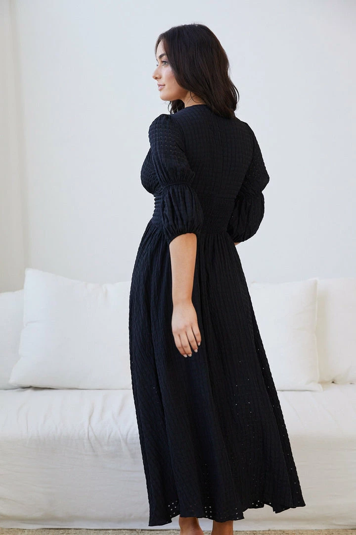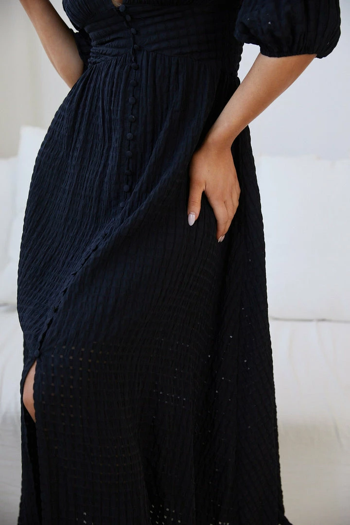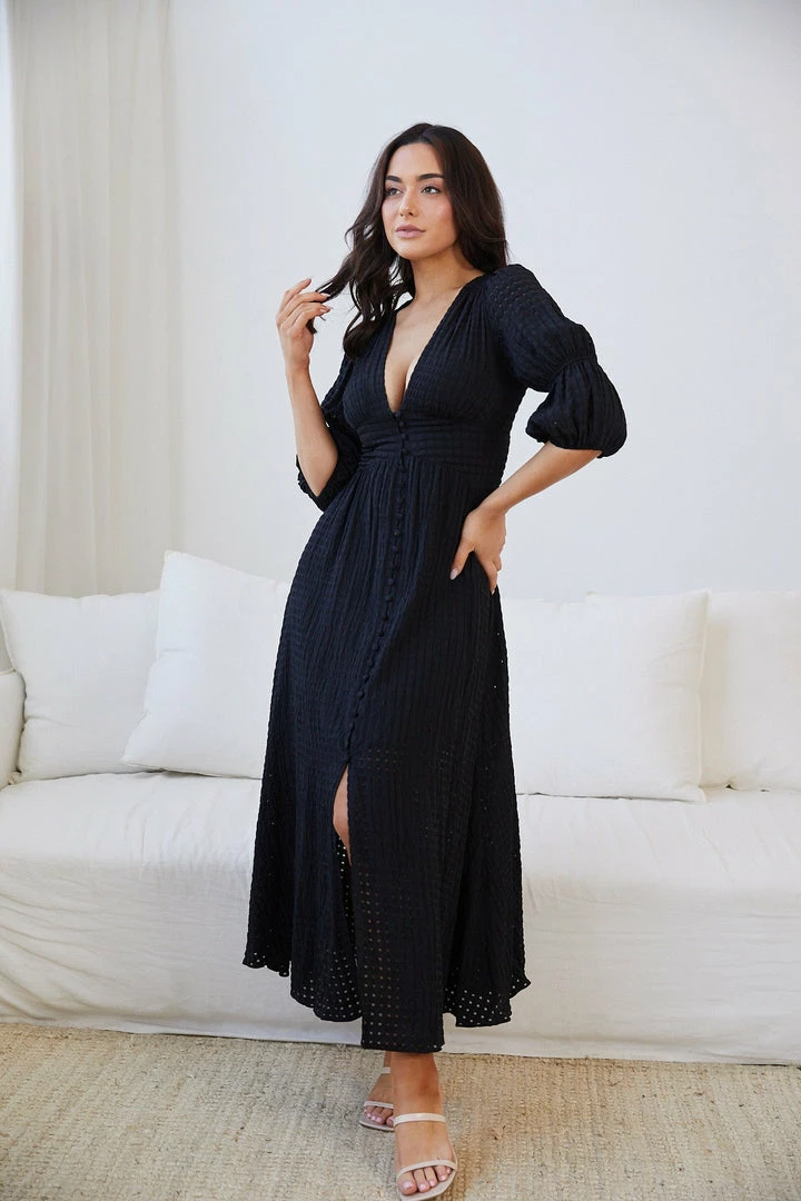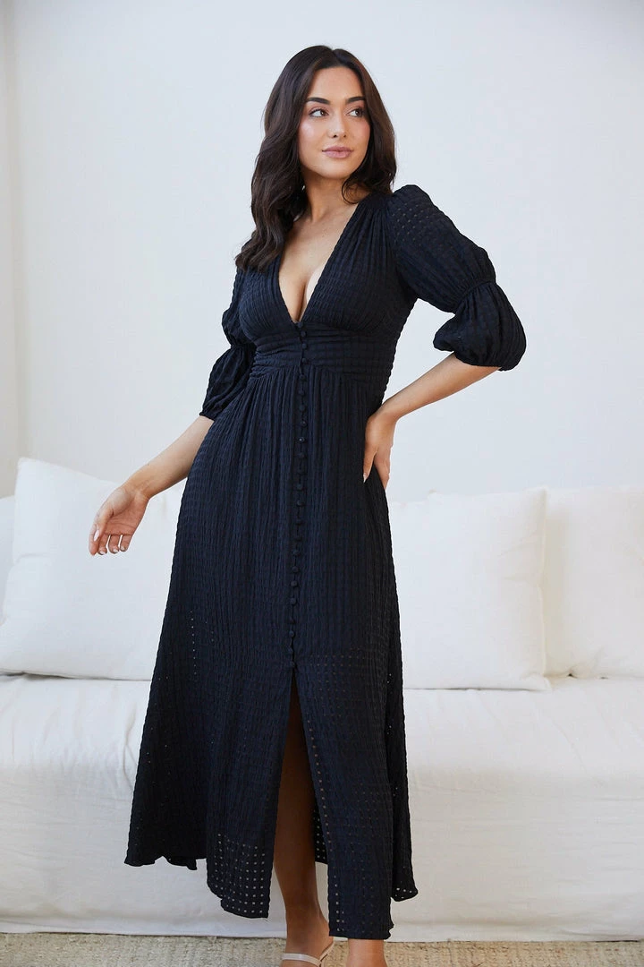 Our Charis Dress comes in a deep black tone. It features a v neckline, short sleeves, and button detailing down the front. This flowy midi pairs beautifully with heels for an effortless transseasonal look!