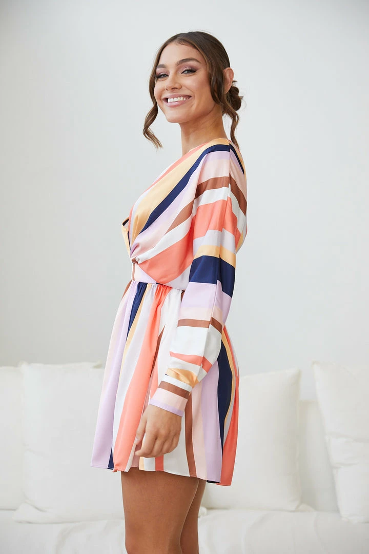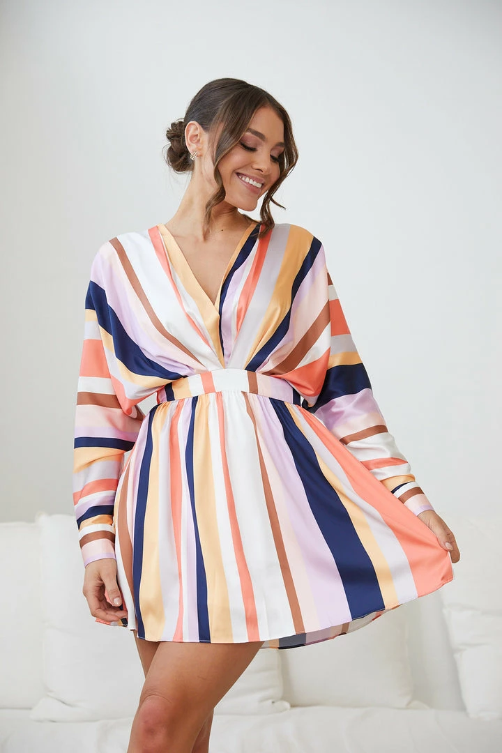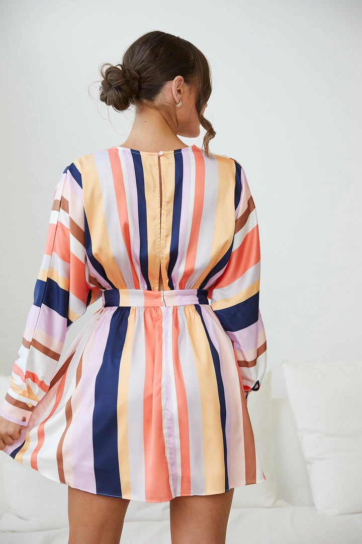 Our Fakassi Dress comes in a beautiful stripe print in shades of white, yellow, lavender, navy, cream, orange and tan. Conquer the fashion dance floor in an upbeat style in this multicoloured mini that features a v-neckline, loose fit on the bodice, long sleeves with cuffs, waistband and a-line skirt. Party your way into fabness by matching this with tangerine open toe stiletto heels and a mini green crossbody bag!