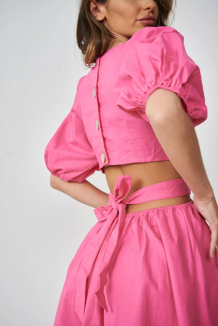 Our Paulene Dress comes in a hot pink tone. It features a plunging v neckline, short sleeves, and side cutouts at the waist. This flowy midi pairs beautifully with heels for an effortless transseasonal look!