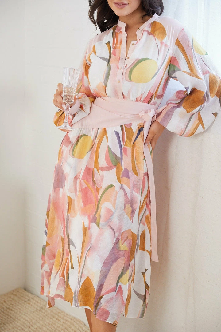Our Delfinia Dress comes in a solid blush pink tone with multicoloured prints. Bringing out an extra spark for a beautiful woman like you, this midi is designed with a mandarin collar, centre-front buttons, long cuffed sleeves, asymmetrical hem and waist tie. Style it with marmalade hued heels and pearl earrings!
