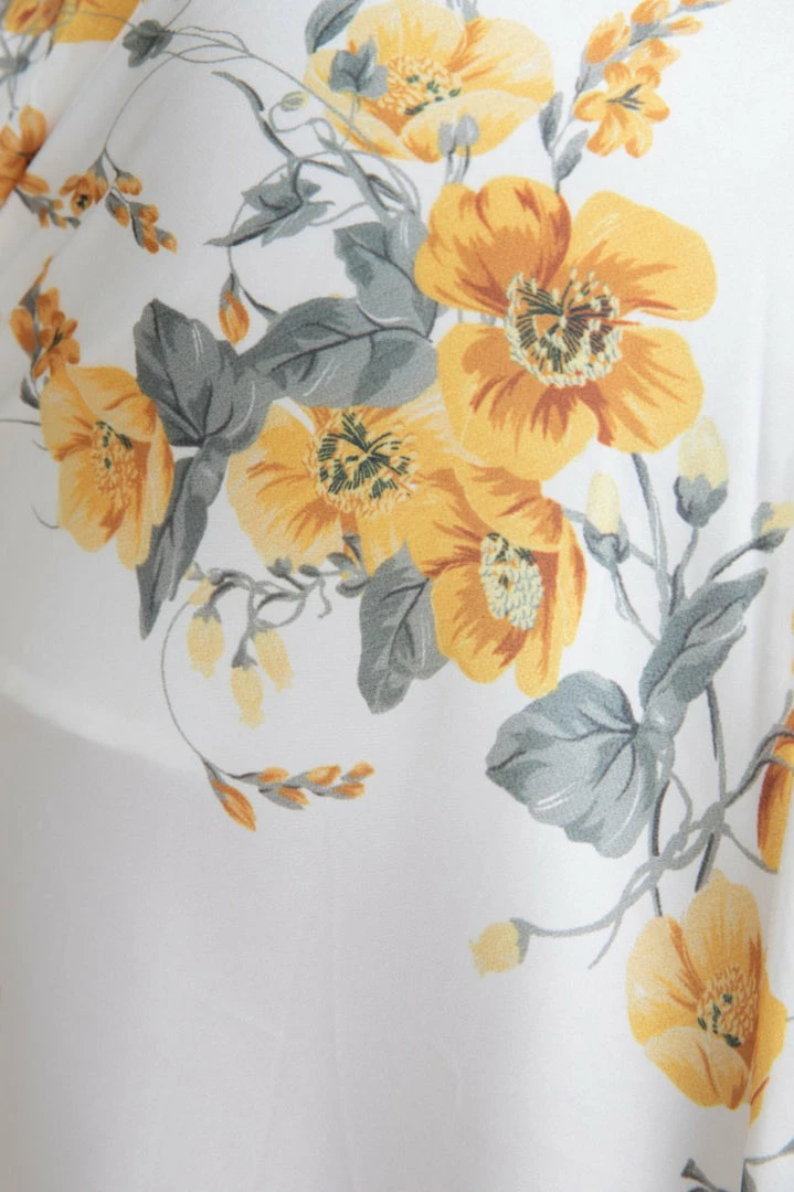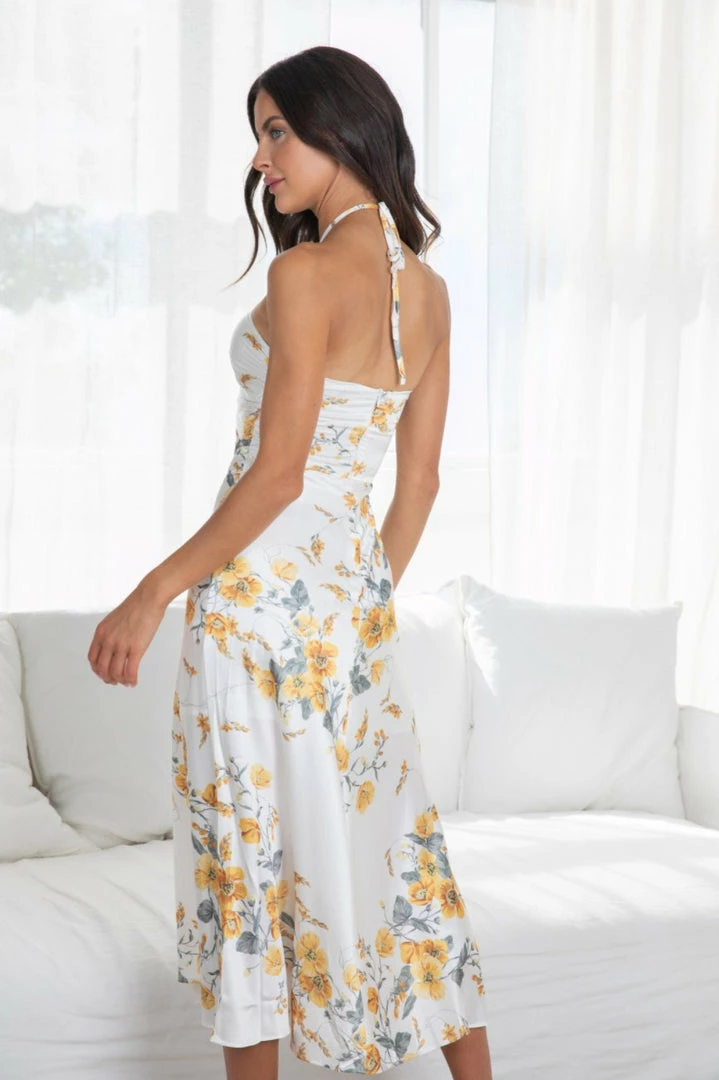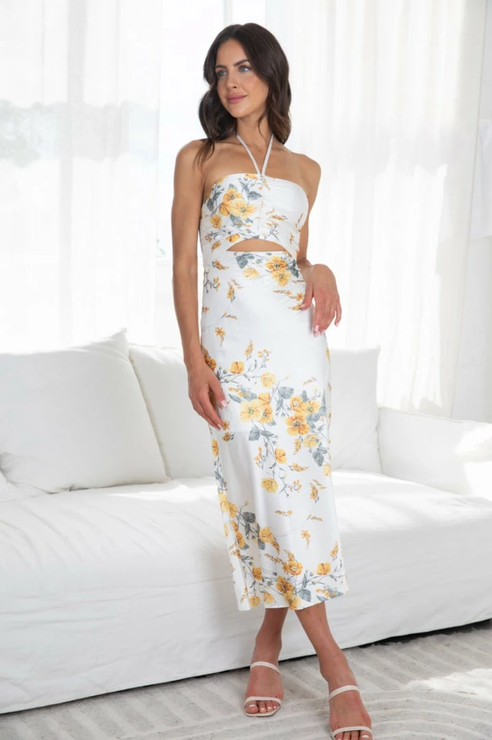 Our Ginerva Dress comes in a fresh white tone with yellow and grey floral prints. Its midi length features a cord neckline and a cutout at the front core. This flowy midi pairs beautifully with heels for a stunning look this spring season!