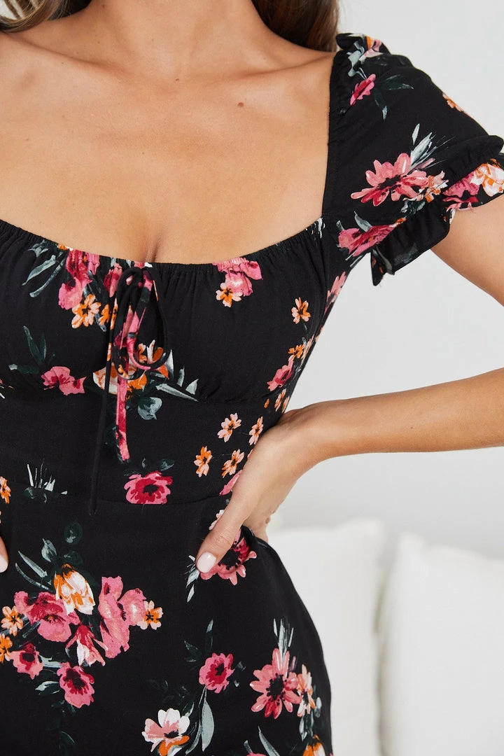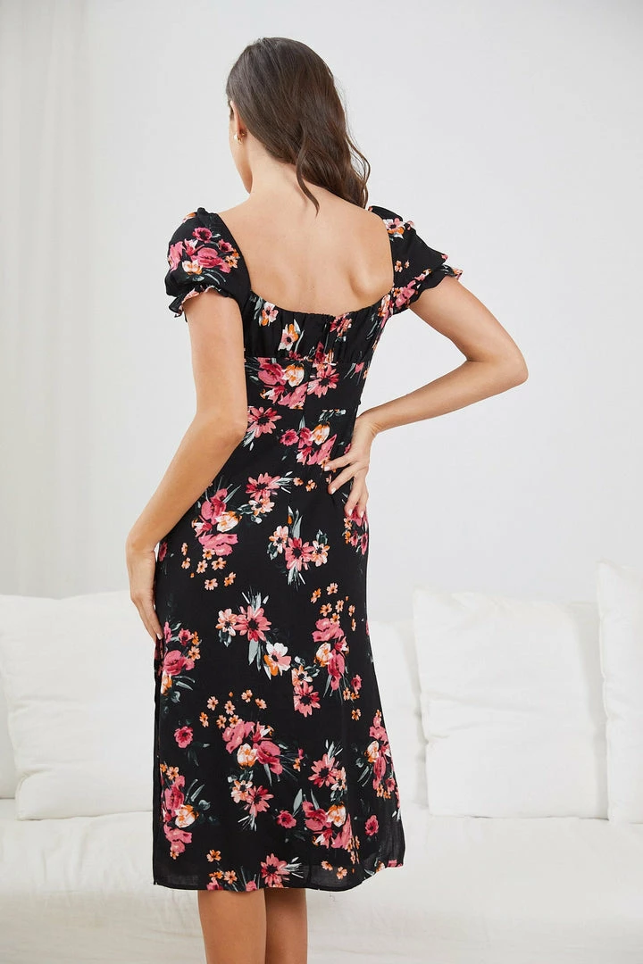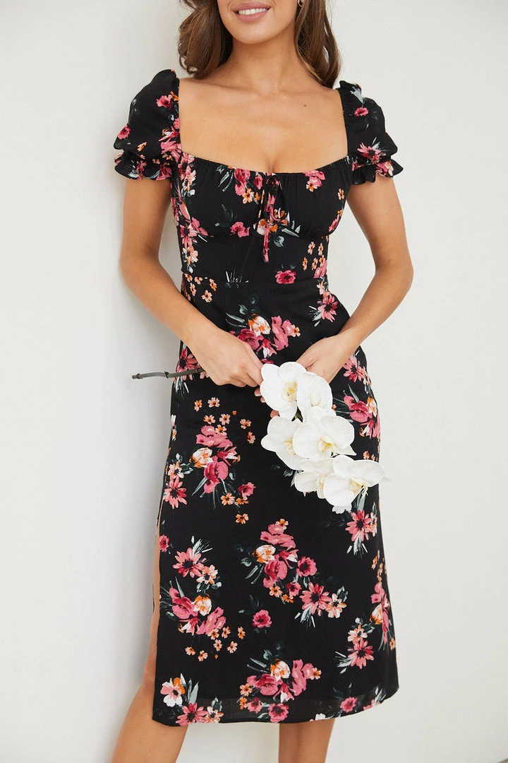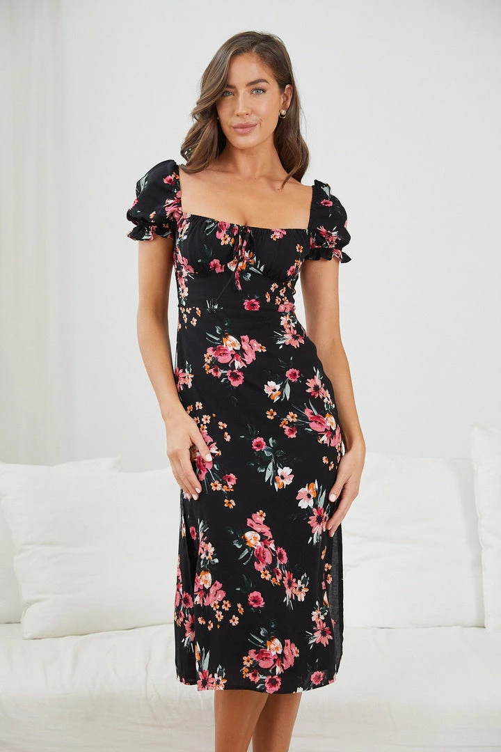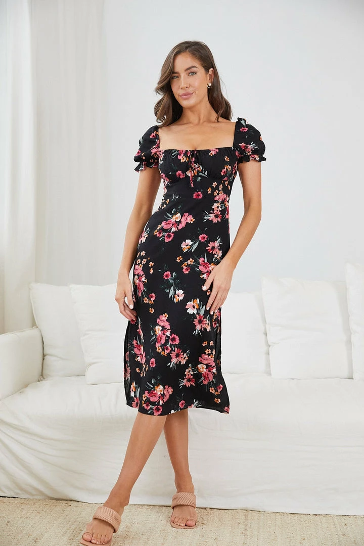 Our Idalia Dress comes in a beautiful black base with multicoloured floral prints. As if you’re far away from the blaring noise of the city, let this midi take you to a tranquil place with its serene shape and detailing. The square neckline with string, subtle puff sleeves with frills, gathering on bust and straight skirt make this a gentle staple that delightfully pairs with pink heels!