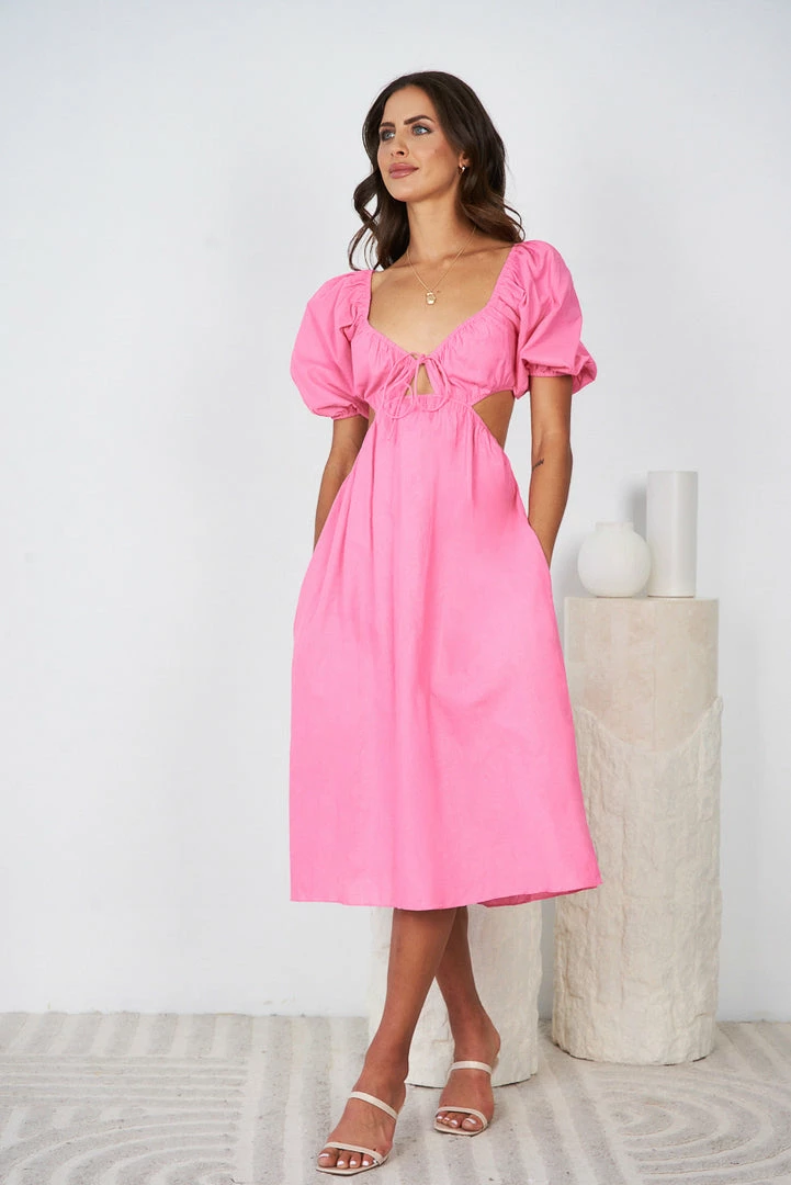Our Jami Dress comes in a bright pink tone. It features a sweetheart neckline and short puffed sleeves for a relaxed, comfortable fit. This dress pairs beautifully with heels for an effortless transseasonal look!