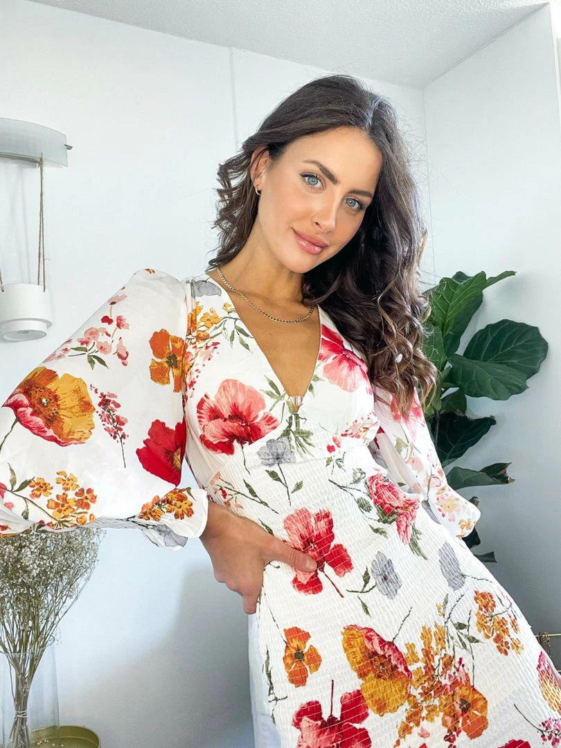 Our Juanita Dress comes in a white tone base, with a red and pink tone floral print. It features a v neckline and long bishop sleeves . This flowy midi pairs beautifully with heels for an effortless transseasonal look!