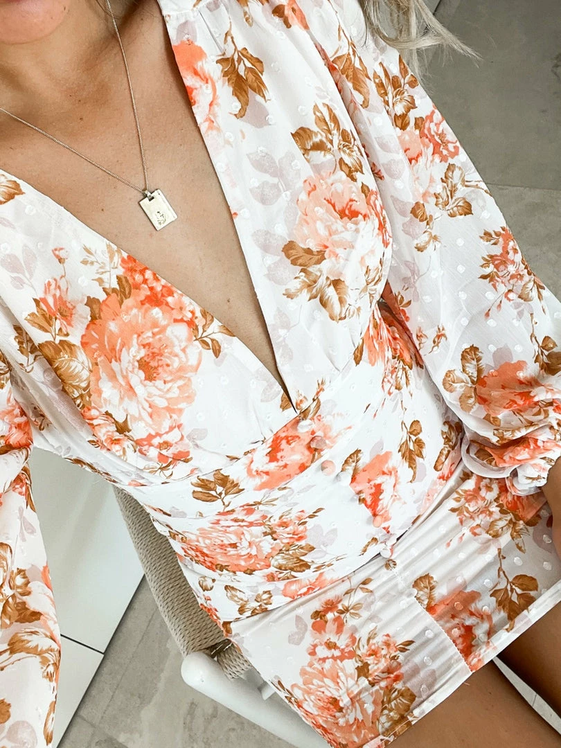 Our Julia Dress comes in a pink blush tone base, with a blush and light blue tone floral print. It features a v neckline and long bishop sleeves. This flowy midi pairs beautifully with heels for an effortless transseasonal look!