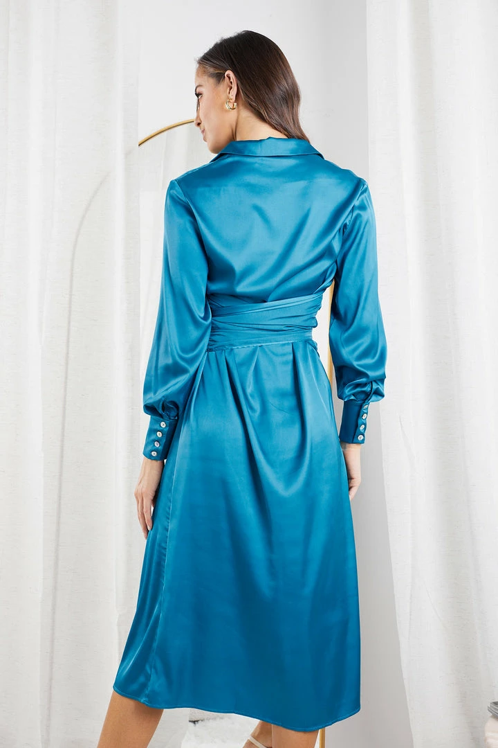- Key Features: Classic collar. Functional centre-front buttons. Long bishop sleeves with cuffs. Waist tie. Midi length. No stretch. Fabric has shine to it. Lightweight. Unlined. Belt to tie attached on both sides of waist. Relaxed sleeves with cinched cuffs, 4 buttons on each cuff.