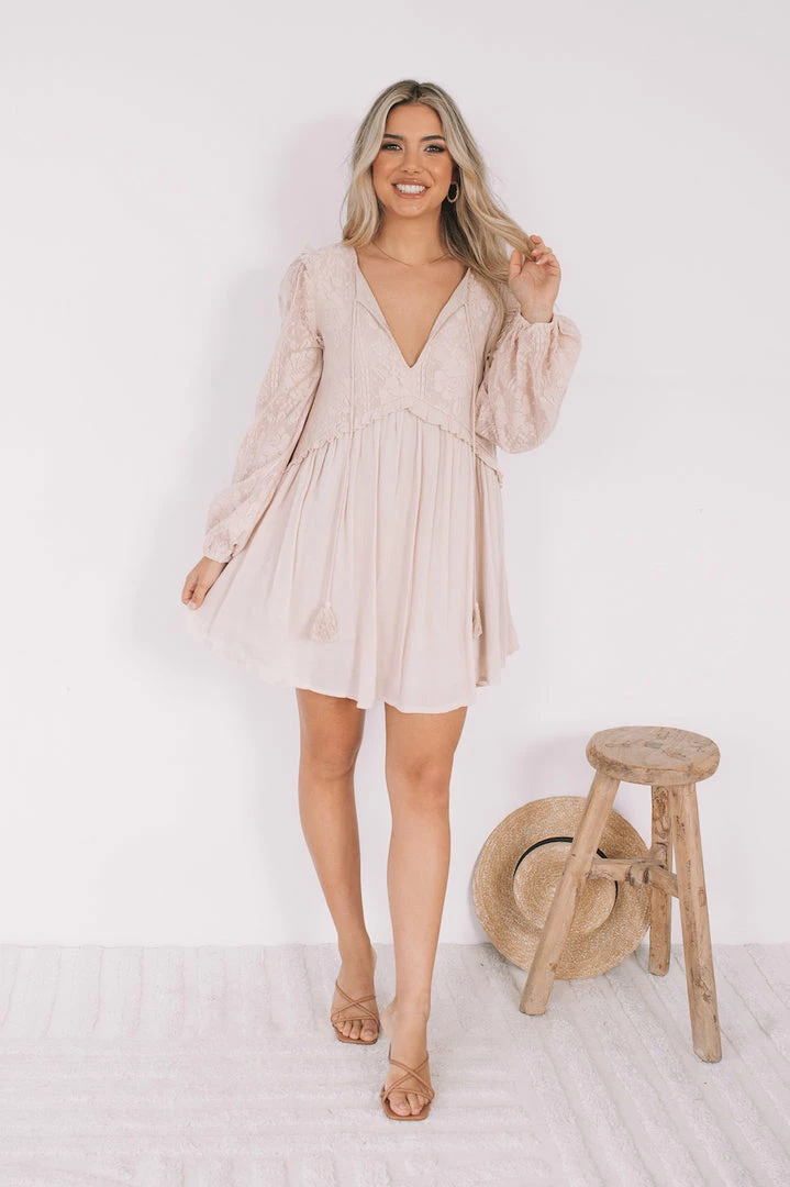 Our Jesintah Dress comes in a soft nude tone in a relaxed fit. This mini is the perfect LBD featuring sheer bishop long sleeves with elastic cuffs, peasant style v neckline with ties and frill bust detailing.