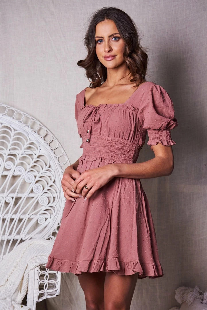 Our Melika Dress comes in a beautiful pink rose tone. It features a square neckline, short sleeves and frill detailing on the hem and waist. This stunning midi pairs wonderfully with heels for an effortless transseasonal look!