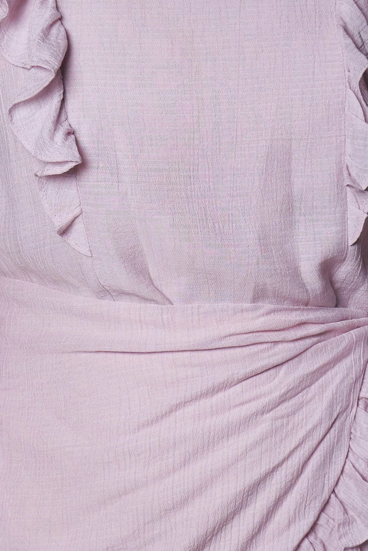 Our Rara Dress comes in a subtle pink blush tone. It features a high neckline, long bishop sleeves cinched at the cuff, and an overlay skirt with attached waist tie. This stunning midi pair beautifully with heels for a stunning formal look!