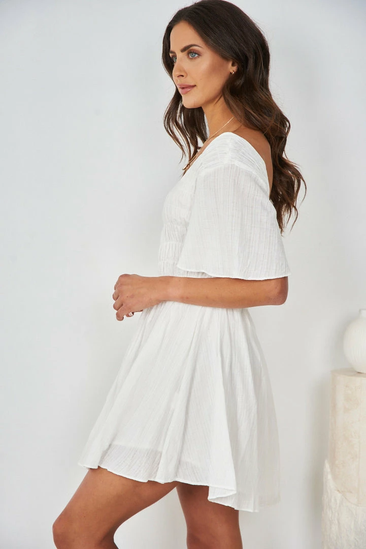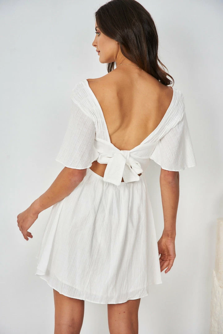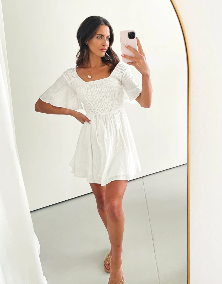 Our Roxy Dress comes in a fresh white tone. This relaxed mini features an elasticated bodice with shirred qualities, relaxed flutter sleeves, gathered skirt, and semi-open back with adjustable tie detailing. This mini is so easy to dress up or down for casual brunches or romantic dates.