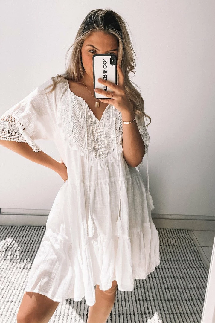 - Key Features: Mini length. Relaxed fit. V neckline. Short sleeve. Lace detailing on neckline, sleeve and back. Tassel detailing. Maternity friendly. Lined skirt (semi sheer). Unlined bust (semi sheer).
