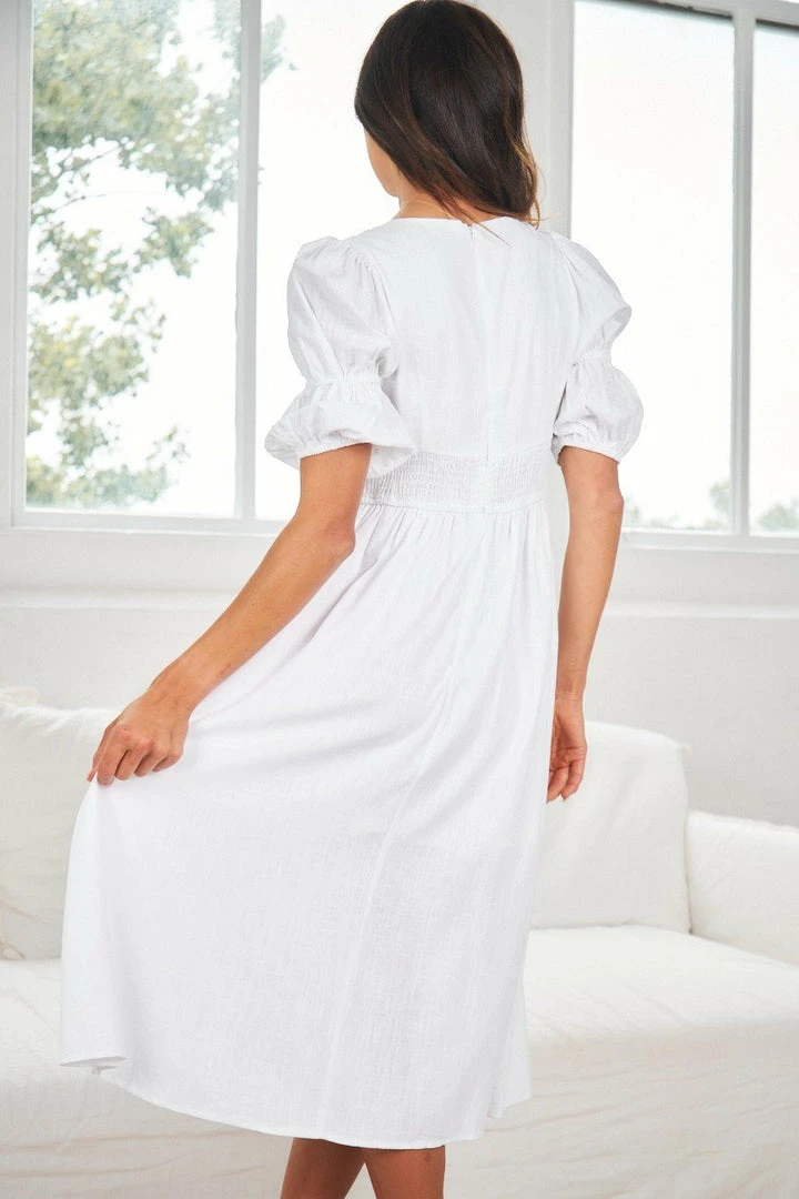 Our Aviona Dress comes in a beautiful white tone. It features a low v-neckline with buttons on the front of the dress that adds drama! This comfortable and practical piece is perfect for running errands or catching up with friends!