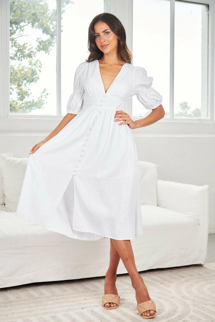 - Key Features: Midi Length. Lightweight material. V neckline. Short sleeves. Flowy skirt. Buttons on the front.