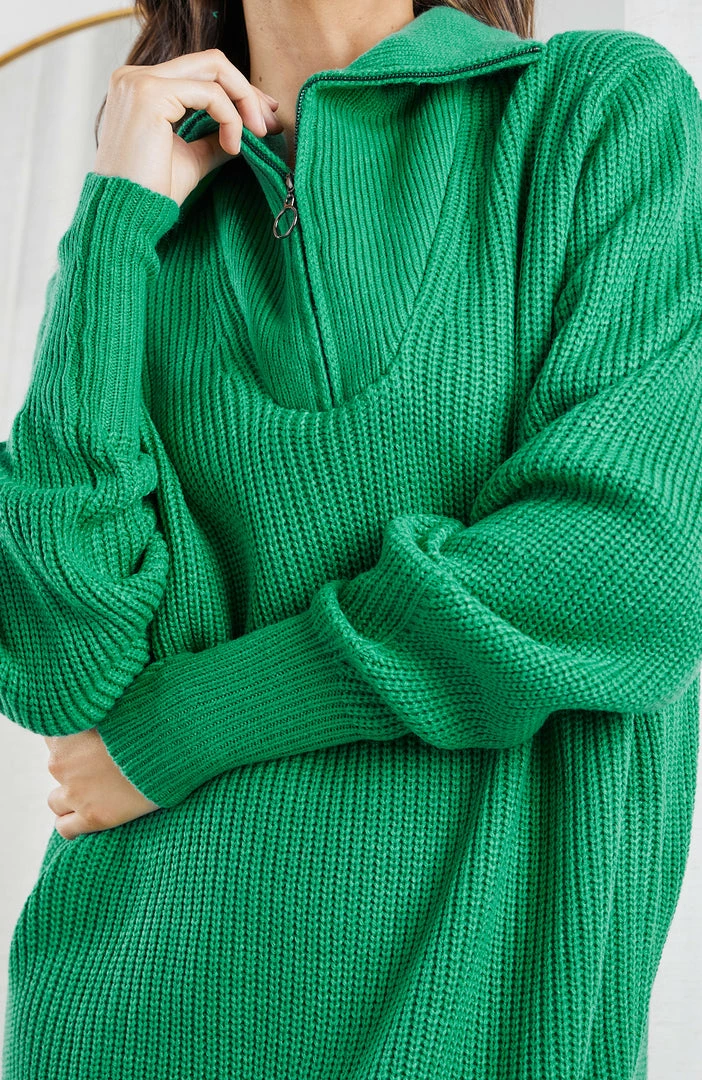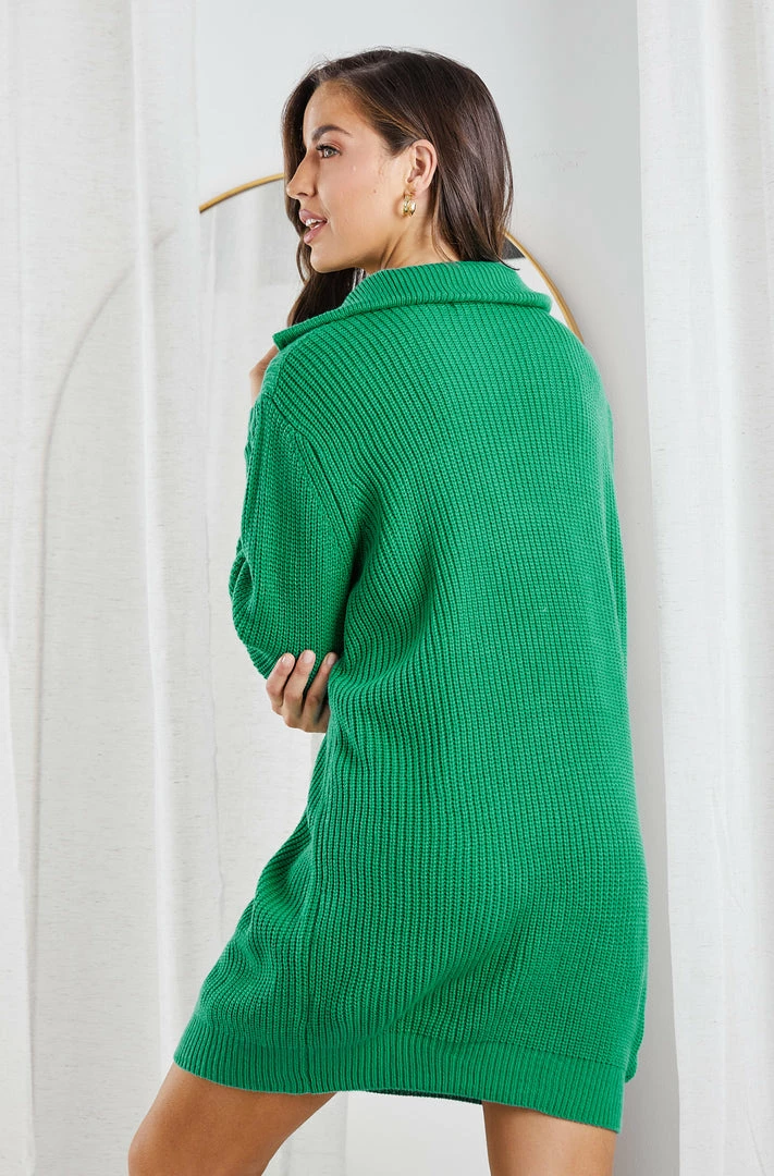 Our Caspere Knit Dress comes in a joyful green colour. Giving your aura an extra charisma, this knitted mini features a high stand collar with silver zip fastening and long balloon sleeves with cinched cuffs. Power up your look with high heeled bootie shoes!