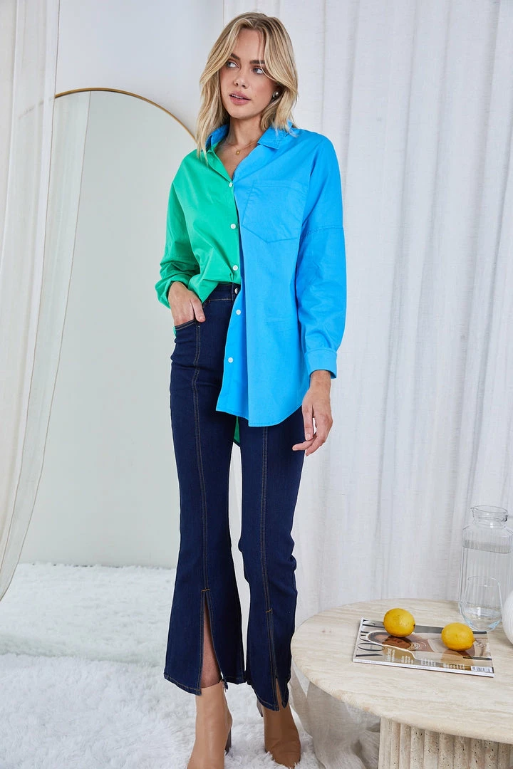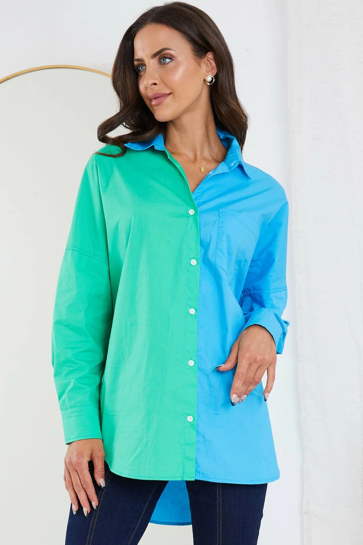 Our Agila Top comes in fun blue and green color. It features a classic collar, pocket on the chest, long sleeves, a v neckline, and buttons down the front to close. This relaxed top pairs beautifully with basic pants for a fun, casual look!