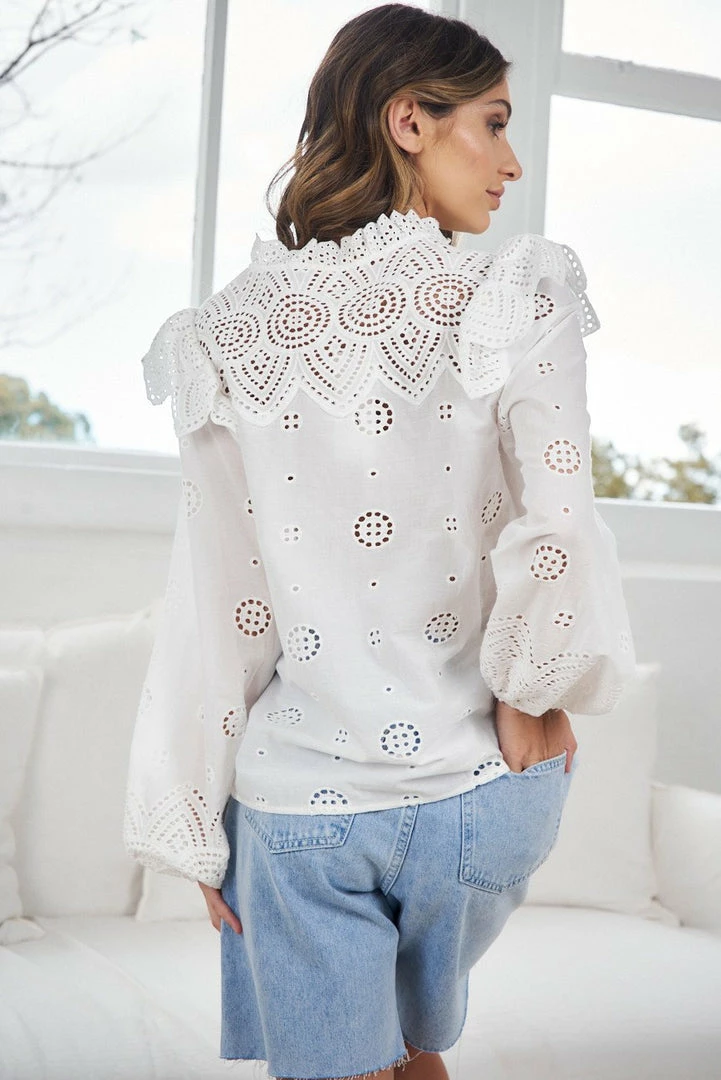 Our Jaden Top comes in a fresh white tone. It features a gathered neckline, long sleeves, & an embroidered pattern all over the garment. This top pairs beautifully with basic pants for a fun casual look!
