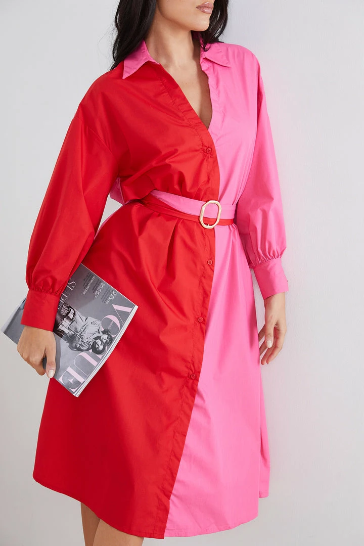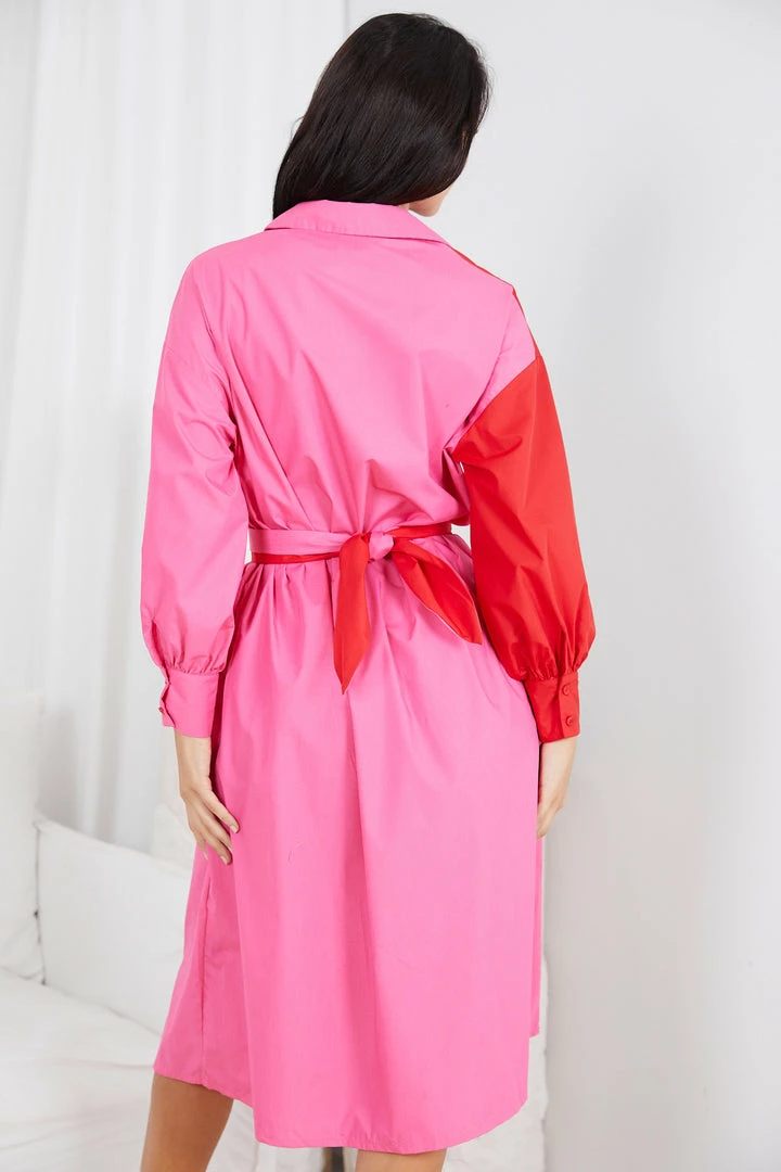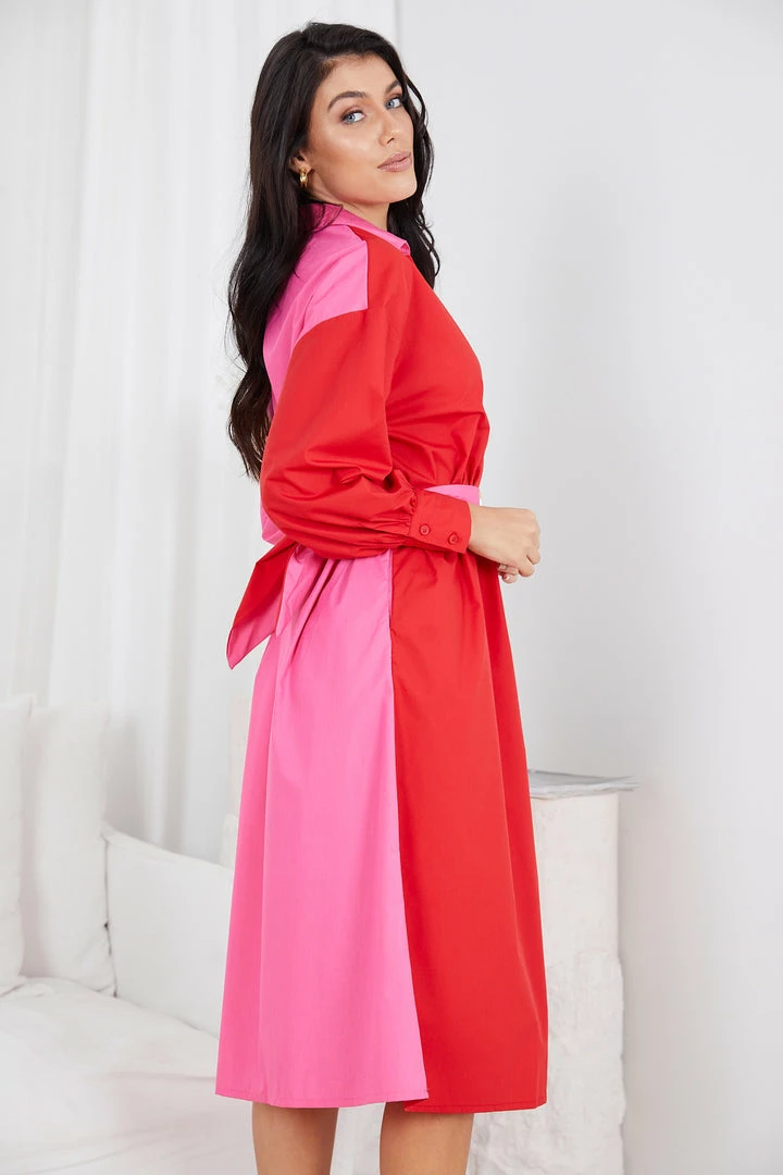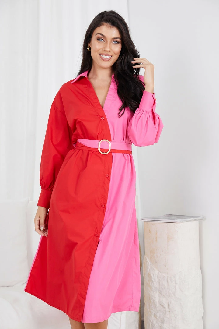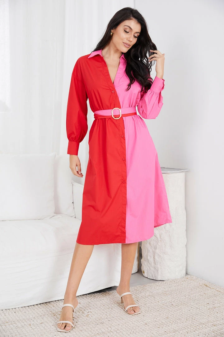 Our Karlitta Dress comes in vivid block colours in the shade of pink and red. Uplifting your spirit with its energetic design and hues, this maxi features a classic collar, v-neckline, buttons down the hem, long cuffed sleeves and a-line skirt. The bow tie belt detailing on the waist is a feminine touch that’s perfect for pairing with floral earrings!