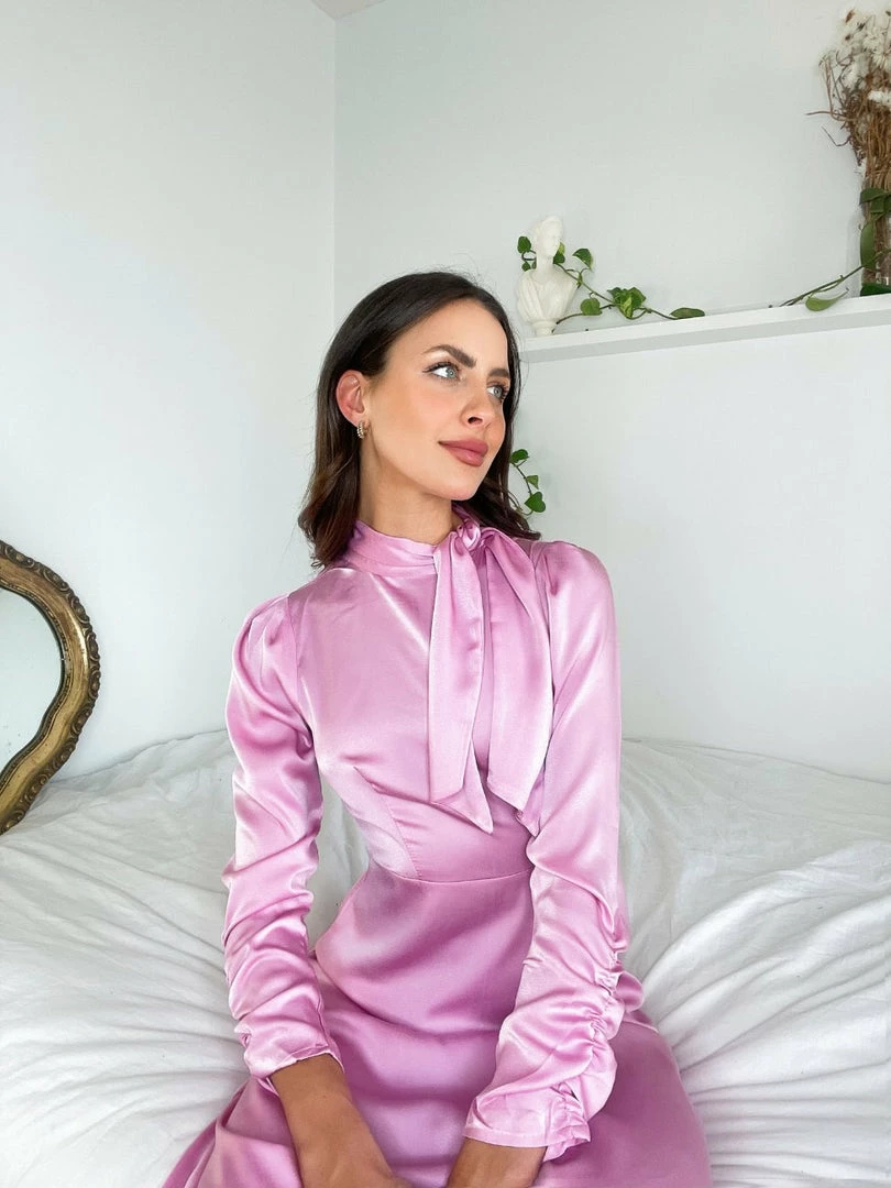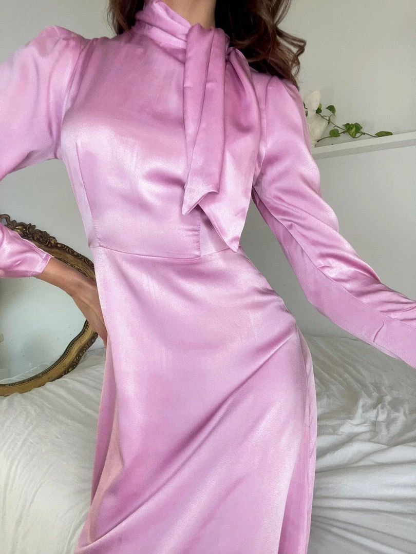 Our Kristy Dress comes in a bold pink tone. It features a high gathered neckline with an ascot-style collar, and long sleeves for a relaxed, comfortable fit. This flowy midi pairs beautifully with heels for a fabulous seasonal look!