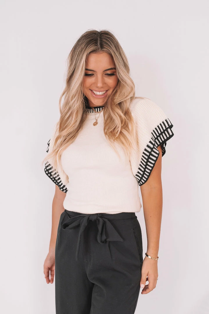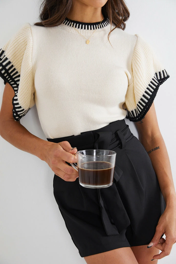 Our Nicolette Knit is a slightly off white tone. It features a high neckline, black stitching details across the neckline & sleeves, and a textured knit pattern all over the garment. Added to your favourite pair of chinos, this knit will give you a classy, elegant look!