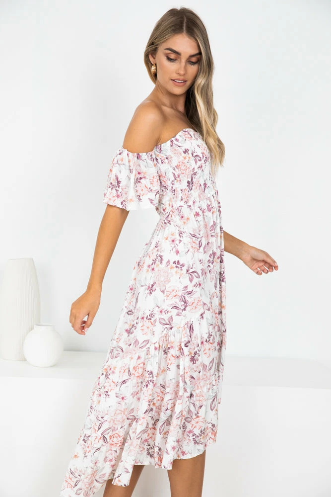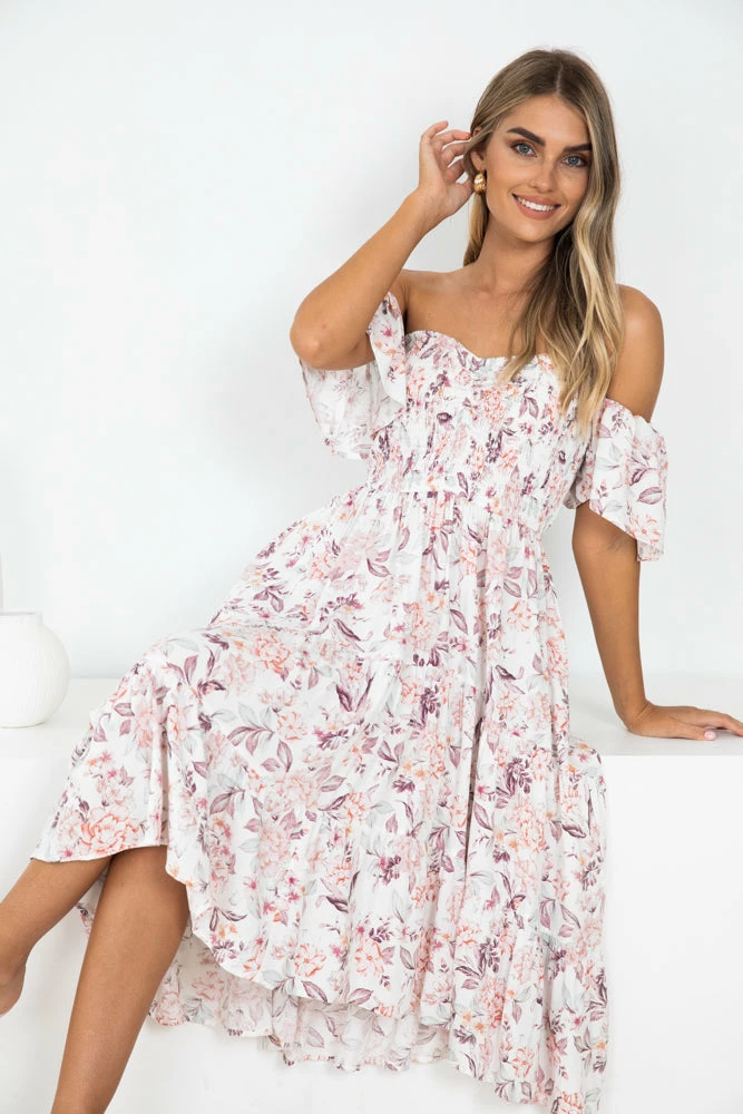 Our Rally Dress is a stunning white base with floral print. It’s a gorgeous lightweight material ideal for the transition to Spring. The relaxed fit, sweetheart neckline, butterfly sleeves, shirred bodice, and flowy skirt make this a boho addition to the wardrobe. This stunning midi dress is sure to transport you to your next holiday just by popping it on!