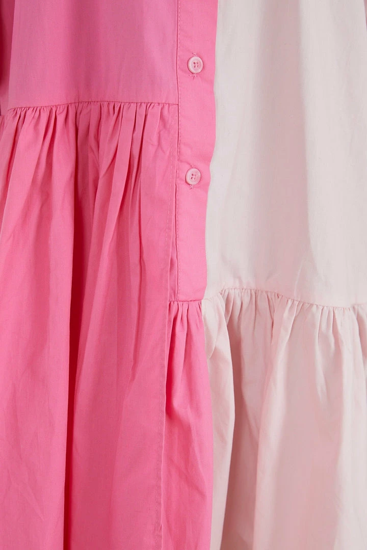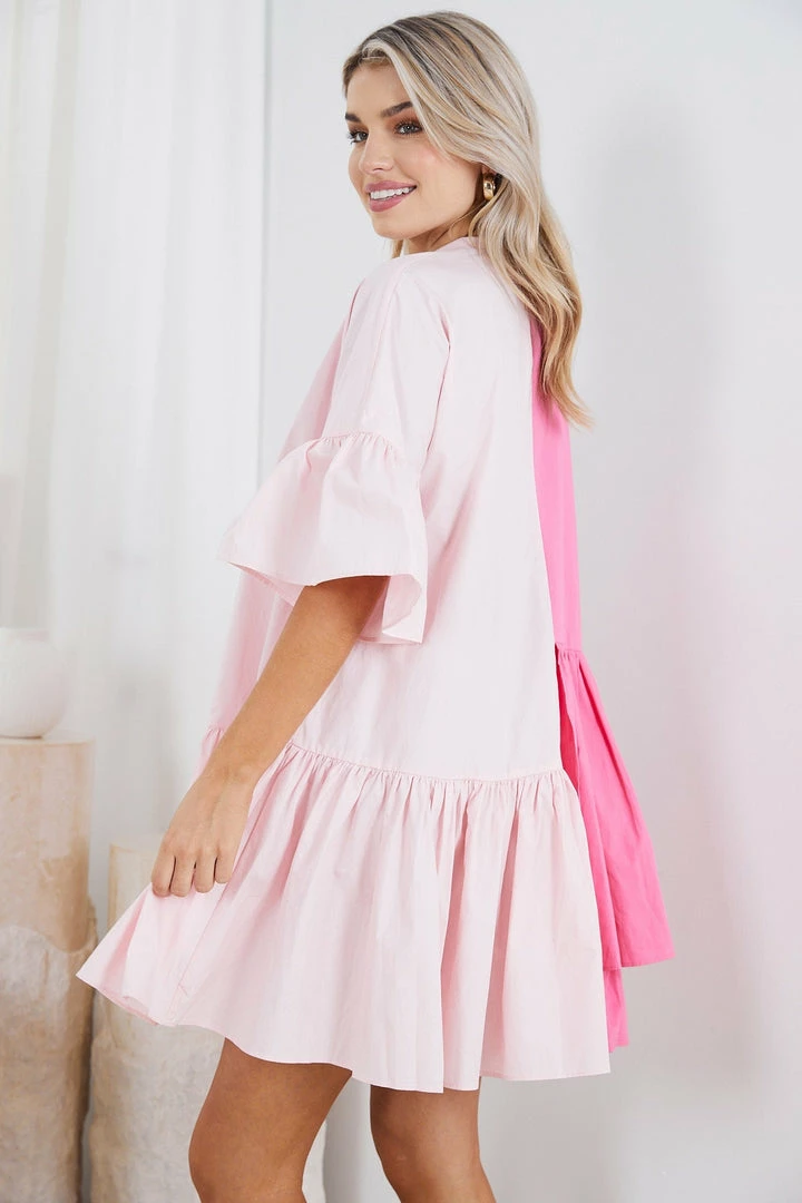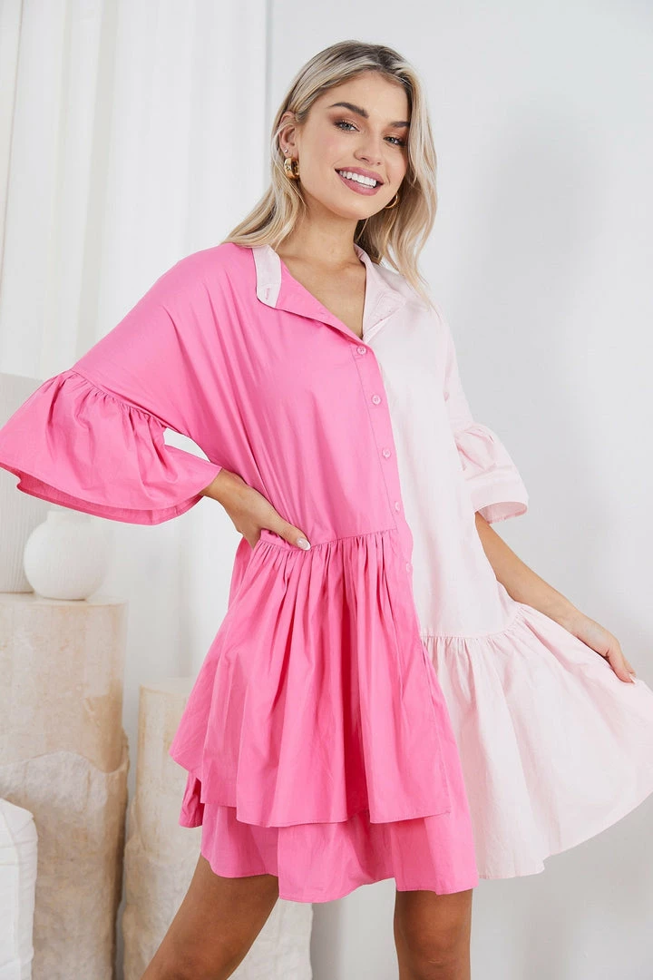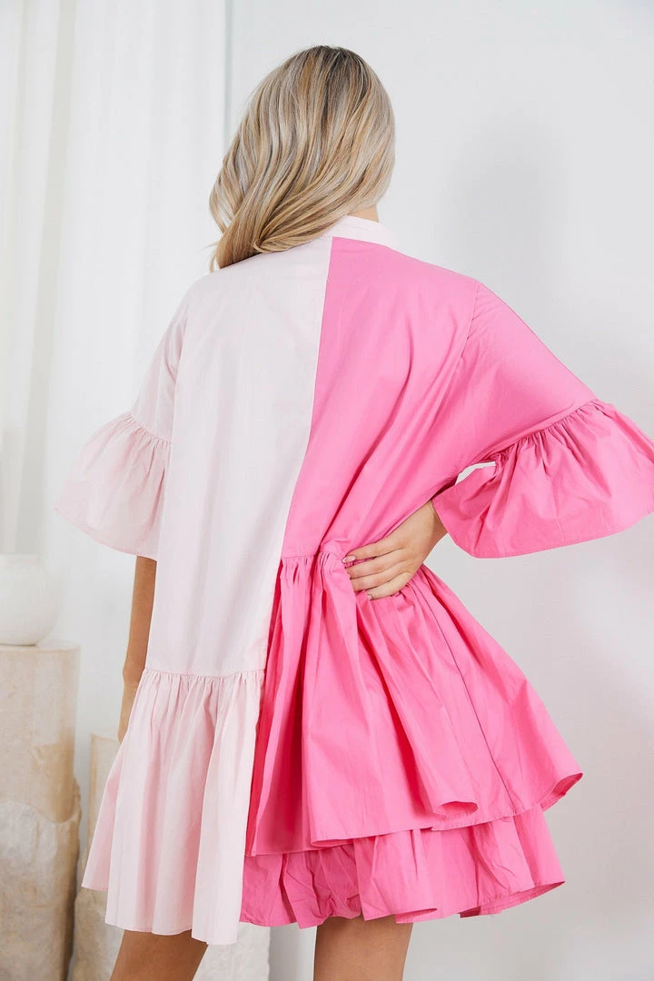 Our Tabbie Dress comes in playful colors Pink and Hot Pink. This mini features a standup collar, buttons down the front, short bell sleeves, oversized fit and a tiered fabric. Pair with your favorite tan sandals and a sun hat for an easy off-duty look!