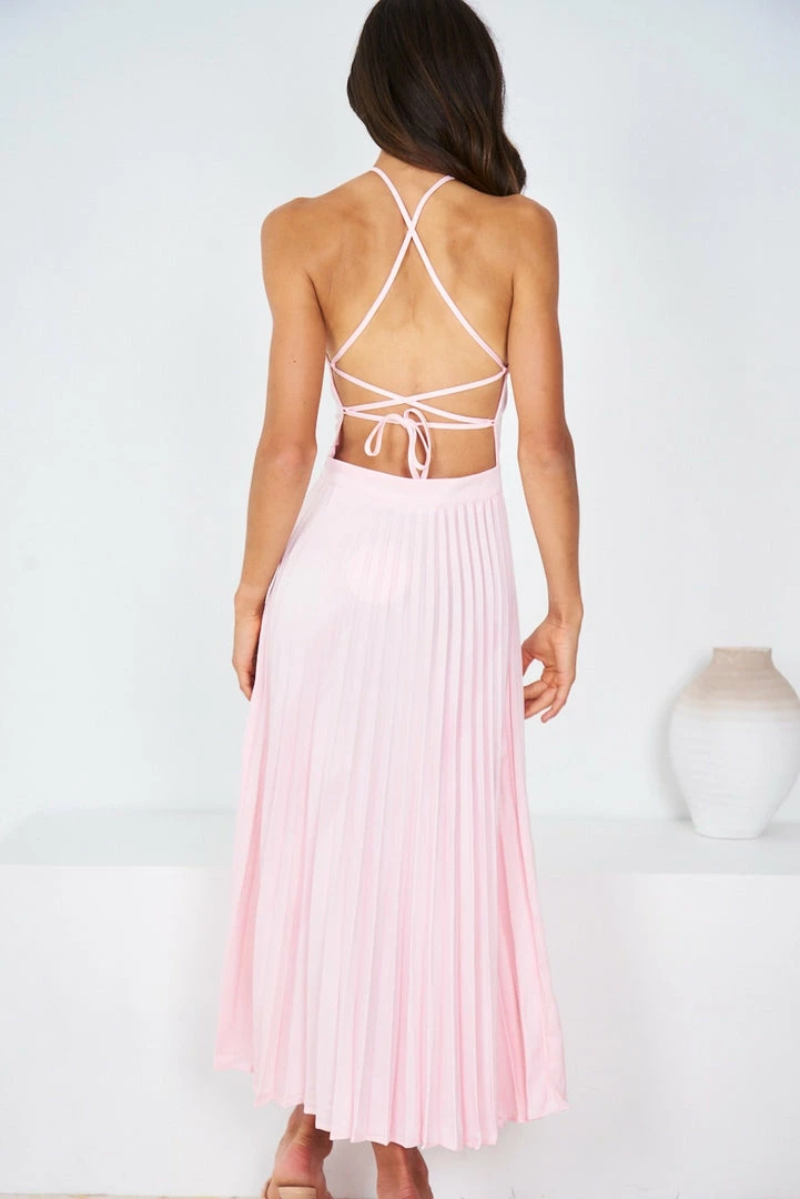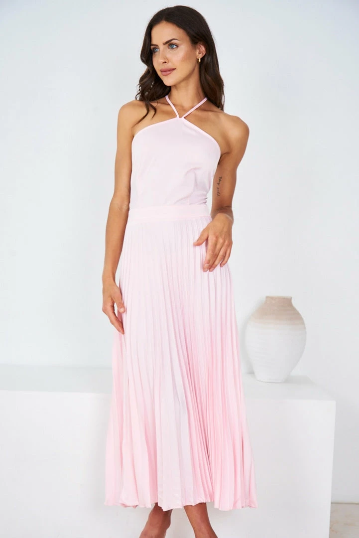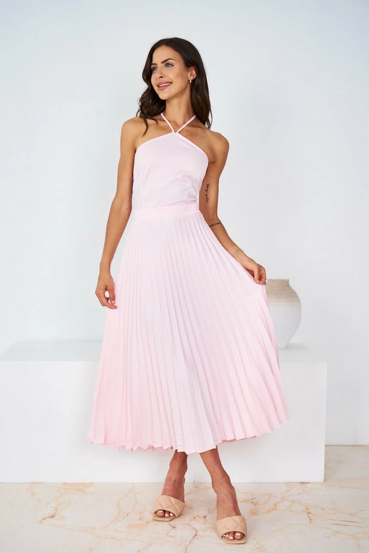Our Desdemona Dress comes in a soft pink tone. It’s a sleeveless midi that’s perfect for warm spring and summer occasions, and pairs beautifully with heels for a stunning formal look!