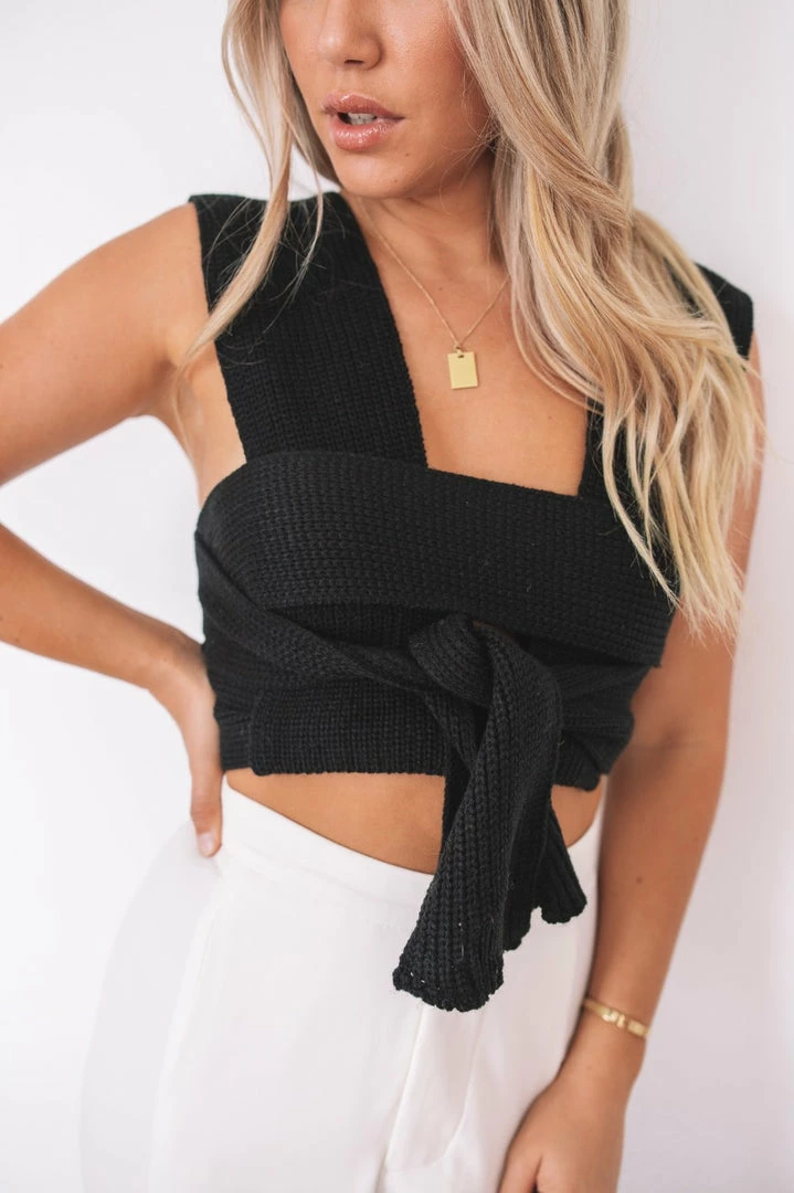 - Key Features: Cropped. Fitted. Wrap-look. Cross bust detailing. Wideband with no sleeves. Tie on front. Knit fabrication. Can be tied in multiple ways.